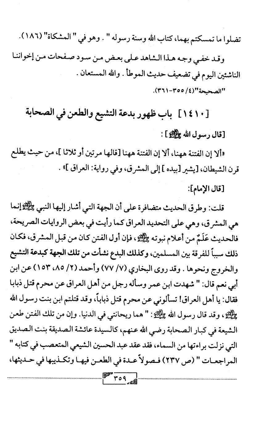 قلت: وطرق الحديث متضافرة على أن الجهة التي أشار إليها النبي - صلى الله عليه وآله وسلم - إنما هي المشرق، وهي على التحديد العراق كما رأيت في بعض الروايات الصريحة، فالحديث عَلَمٌ من أعلام نبوته - صلى الله عليه وآله وسلم -، فإن أول الفتن كان من قبل المشرق، فكان ذلك سبباً للفرقة بين المسلمين، وكذلك البدع نشأت من تلك الجهة كبدعة التشيع والخروج ونحوها. وقد روى البخاري (7/ 77) وأحمد (2/ 85، 153) عن ابن أبي نعم قال: " شهدت ابن عمر وسأله رجل من أهل العراق عن محرم قتل ذبابا فقال: يا أهل العراق! تسألوني عن محرم قتل ذباباً، وقد قتلتم ابن بنت رسول الله - صلى الله عليه وآله وسلم -، وقد قال رسول الله - صلى الله عليه وآله وسلم -: " هما ريحانتي في الدنيا. وإن من تلك الفتن طعن الشيعة في كبار الصحابة رضي الله عنهم، كالسيدة عائشة الصديقة بنت الصديق التي نزلت براءتها من السماء، فقد عقد عبد الحسين الشيعي المتعصب في كتابه " المراجعات " (ص 237) فصولاً عدة في الطعن فيها وتكذيبها في حديثها،