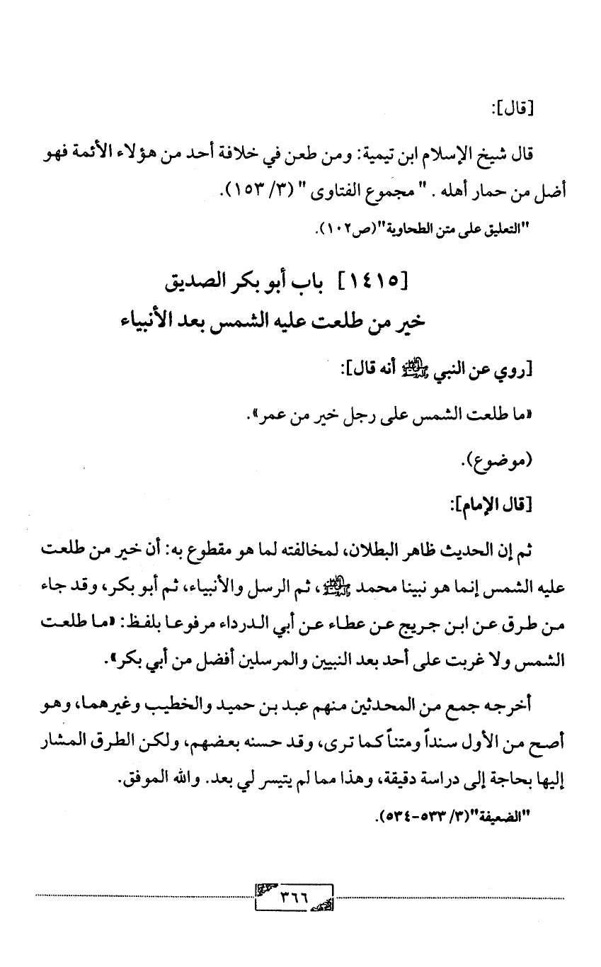 ثم إن الحديث ظاهر البطلان، لمخالفته لما هو مقطوع به: أن خير من طلعت عليه الشمس إنما هو نبينا محمد - صلى الله عليه وآله وسلم -، ثم الرسل والأنبياء، ثم أبو بكر، وقد جاء من طرق عن ابن جريج عن عطاء عن أبي الدرداء مرفوعا بلفظ: «ما طلعت الشمس ولا غربت على أحد بعد النبيين والمرسلين أفضل من أبي بكر».