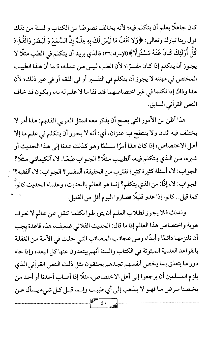 كان جاهلًا بعلم أن يتكلم فيه؛ لأنه يخالف نصوصًا من الكتاب والسنة من ذلك قول ربنا تبارك وتعالى: {وَلا تَقْفُ مَا لَيْسَ لَكَ بِهِ عِلْمٌ إِنَّ السَّمْعَ وَالْبَصَرَ وَالْفُؤَادَ كُلُّ أُوْلَئِكَ كَانَ عَنْهُ مَسْئُولًا} (الإسراء:36) فالذي يريد أن يتكلم في الطب مثلًا لا يجوز أن يتكلم إذا كان مفسرًا؛ لأن الطب ليس من عمله، كما أن هذا الطبيب المختص في مهنته لا يجوز أن يتكلم في التفسير أو في الفقه أو في غير ذلك؛ لأن هذا وذاك إذا تكلما في غير اختصاصهما فقد قفا ما لا علم له به، ويكون قد خاف النص القرآني السابق.