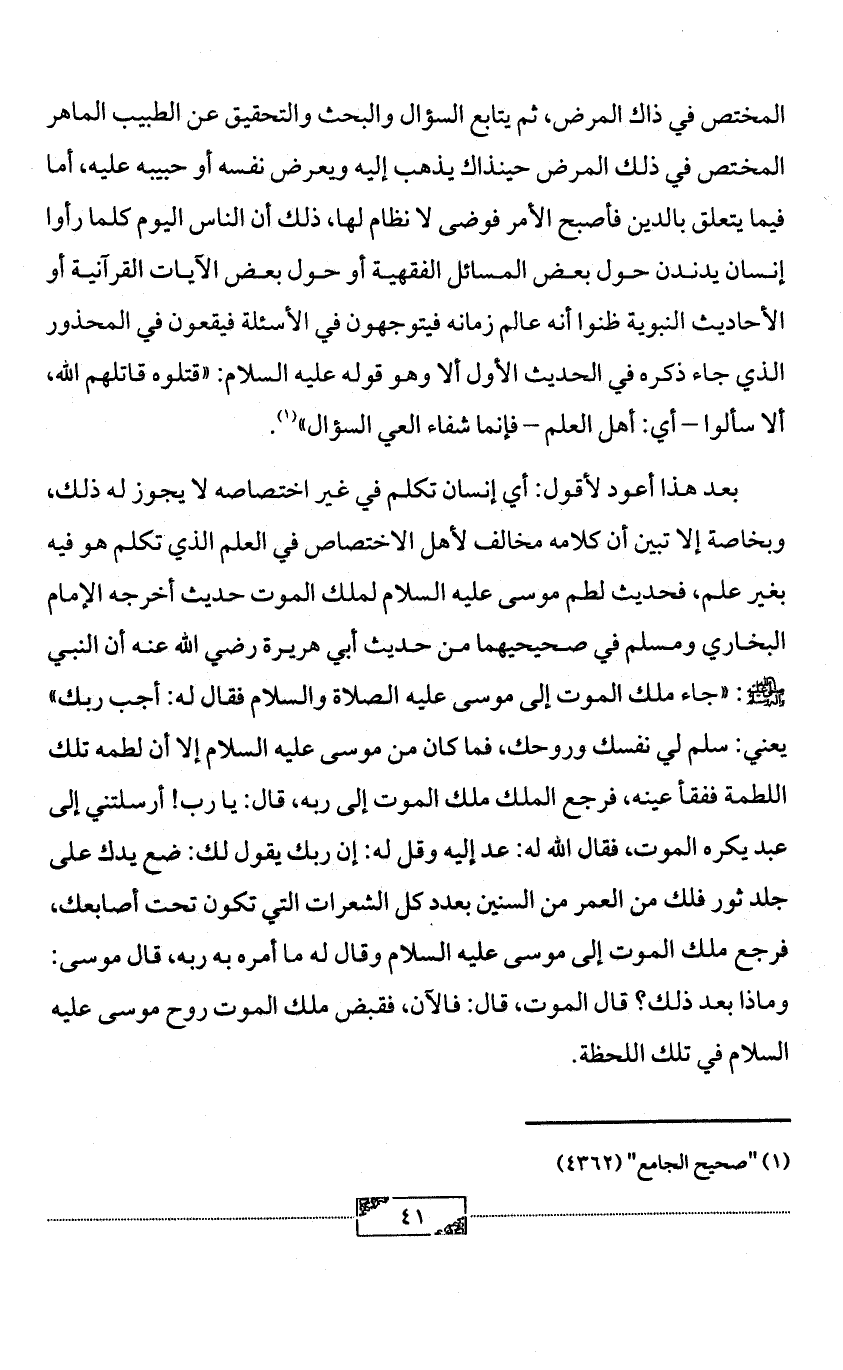 بعد هذا أعود لأقول: أي إنسان تكلم في غير اختصاصه لا يجوز له ذلك، وبخاصة إلا تبين أن كلامه مخالف لأهل الاختصاص في العلم الذي تكلم هو فيه بغير علم، فحديث لطم موسى عليه السلام لملك الموت حديث أخرجه الإمام البخاري ومسلم في صحيحيهما من حديث أبي هريرة رضي الله عنه أن النبي - صلى الله عليه وآله وسلم -: «جاء ملك الموت إلى موسى عليه الصلاة والسلام فقال له: أجب ربك» يعني: سلم لي نفسك وروحك، فما كان من موسى عليه السلام إلا أن لطمه تلك اللطمة ففقأ عينه، فرجع الملك ملك الموت إلى ربه، قال: يا رب! أرسلتني إلى عبد يكره الموت، فقال الله له: عد إليه وقل له: إن ربك يقول لك: ضع يدك على جلد ثور فلك من العمر من السنين بعدد كل الشعرات التي تكون تحت أصابعك، فرجع ملك الموت إلى موسى عليه السلام وقال له ما أمره به ربه، قال موسى: وماذا بعد ذلك؟ قال الموت، قال: فالآن، فقبض ملك الموت روح موسى عليه السلام في تلك اللحظة.