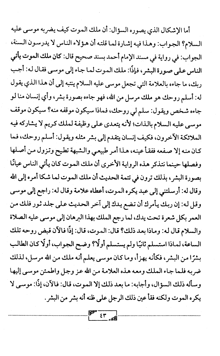 أما الإشكال الذي يصوره السؤال: أن ملك الموت كيف يضربه موسى عليه السلام؟ الجواب: وهذا فيه إشارة لما قلته أن هؤلاء الناس لا يدرسون السنة، الجواب: في رواية في مسند الإمام أحمد بسند صحيح قال: كان ملك الموت يأتي الناس على صورة البشر، فإذًا: ملك الموت لما جاء إلى موسى فقال له: أجب ربك، ما جاءه بالعلامة التي تجعل موسى عليه السلام ينتبه إلى أن هذا الذي يقول له: أسلم روحك هو ملك مرسل من الله، فهو جاءه بصورة بشر، وأي إنسان منا لو جاءه شخص ويقول: سلم لي روحك، فماذا سيكون موقفه منه؟ سيكون موقف موسى عليه السلام بالذات؛ لأنه يتعدى على وظيفة لملك كريم لا يشاركه فيه الملائكة الآخرون، فكيف إنسان يتقدم إلى بشر مثله ويقول: أسلم روحك، فما كان منه إلا صفعه ففقأ عينه، هذا أمر طبيعي والشبهة تطيح وتزول من أصلها وفصلها حينما نتذكر هذه الرواية الأخرى أن ملك الموت كان يأتي الناس عيانًا بصورة البشر، بذلك ترون في تتمة الحديث أن ملك الموت لما شكا أمره إلى الله وقال له: أرسلتني إلى عبد يكره الموت، أعطاه علامة وقال له: راجع إلى موسى وقل له: إن ربك يأمرك أن تضع يدك إلى آخر الحديث على جلد ثور فلك من العمر بكل شعرة تحت يدك، لما رجع الملك بهذا البرهان إلى موسى عليه الصلاة والسلام قال له: وماذا بعد ذلك؟ قال: الموت، قال: إذًا فالآن قبض روحه تلك الساعة، لماذا استسلم ثانيًا ولم يستسلم أولًا؟ وضح الجواب، أولًا كان الطالب بشرًا من البشر، فكأنه يهزأ، وما كان موسى يعلم أنه ملك من الله مرسل، لذلك ضربه فلما جاء الملك ومعه هذه العلامة من الله عز وجل واطمئن موسى إليها وسأله ذلك السؤال، وأجابه: ما بعد ذلك إلا الموت، قال: فالآن، إذًا: موسى لا يكره الموت ولكنه فقأ عين ذلك الرجل على ظنه أنه بشر من البشر.