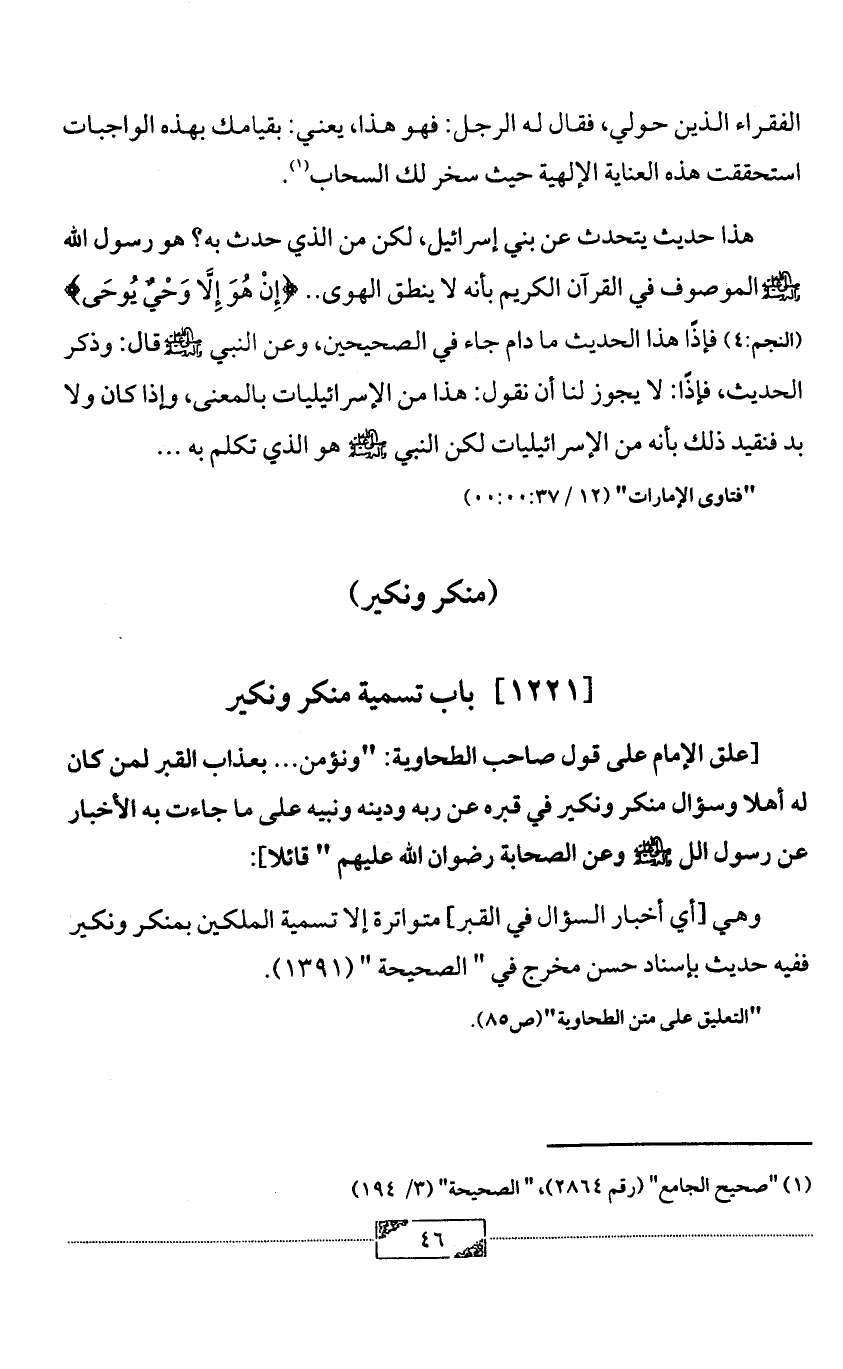[علق الإمام على قول صاحب الطحاوية: "ونؤمن ... بعذاب القبر لمن كان له أهلا وسؤال منكر ونكير في قبره عن ربه ودينه ونبيه على ما جاءت به الأخبار عن رسول الل - صلى الله عليه وآله وسلم - وعن الصحابة رضوان الله عليهم " قائلا]:
