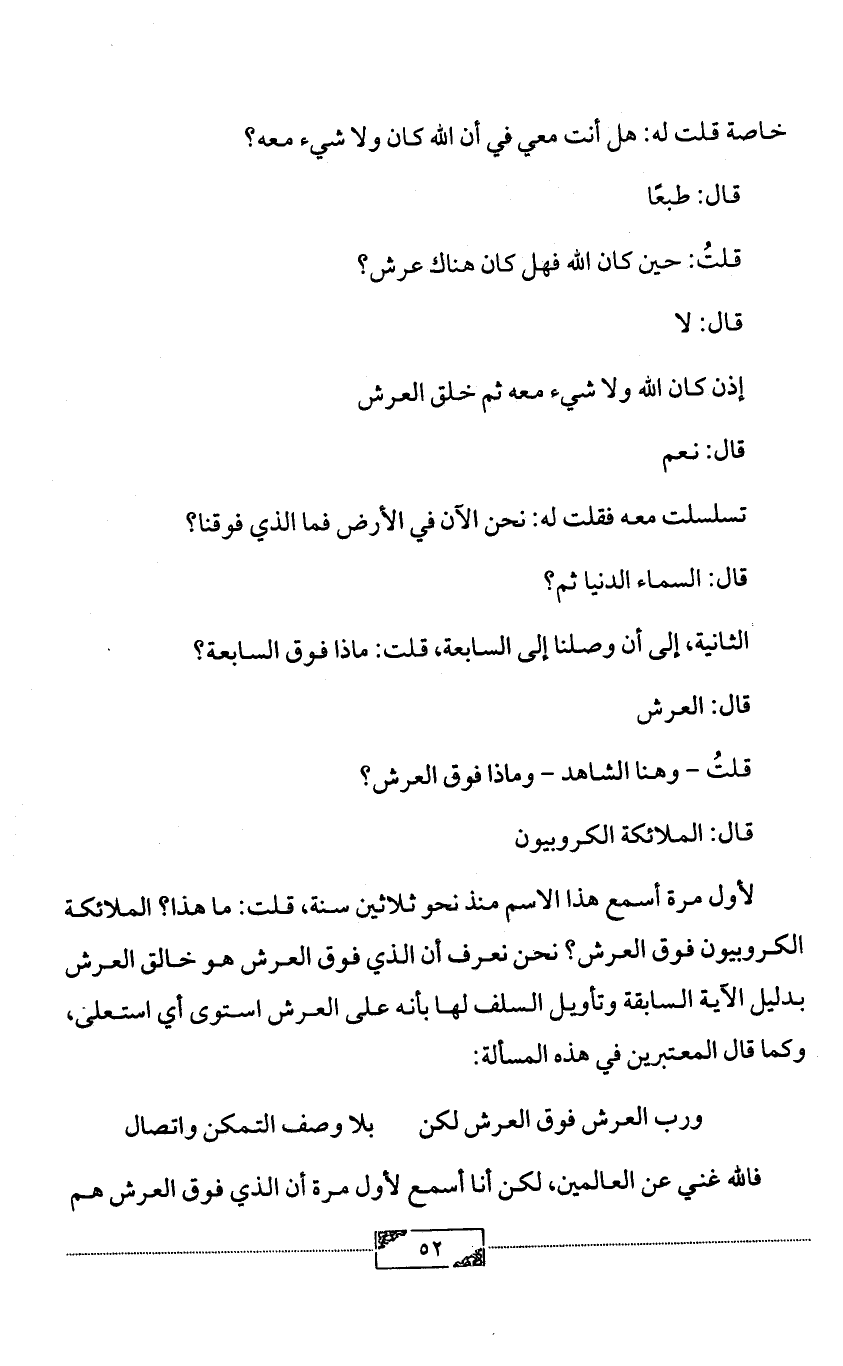 خاصة قلت له: هل أنت معي في أن الله كان ولا شيء معه؟