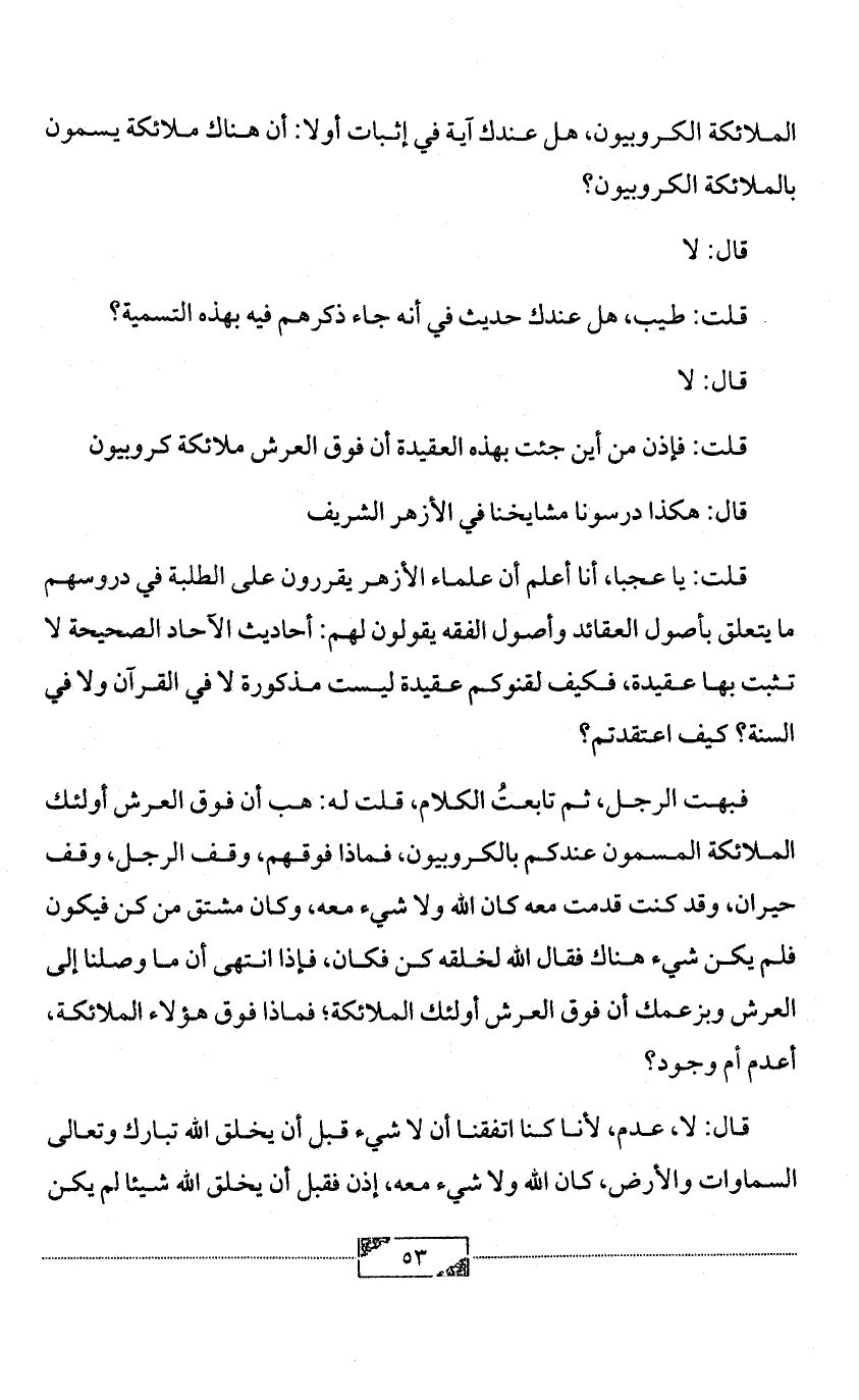فبهت الرجل, ثم تابعتُ الكلام, قلت له: هب أن فوق العرش أولئك الملائكة المسمون عندكم بالكروبيون, فماذا فوقهم, وقف الرجل, وقف حيران, وقد كنت قدمت معه كان الله ولا شيء معه، وكان مشتق من كن فيكون فلم يكن شيء هناك فقال الله لخلقه كن فكان، فإذا انتهى أن ما وصلنا إلى العرش وبزعمك أن فوق العرش أولئك الملائكة؛ فماذا فوق هؤلاء الملائكة, أعدم أم وجود؟