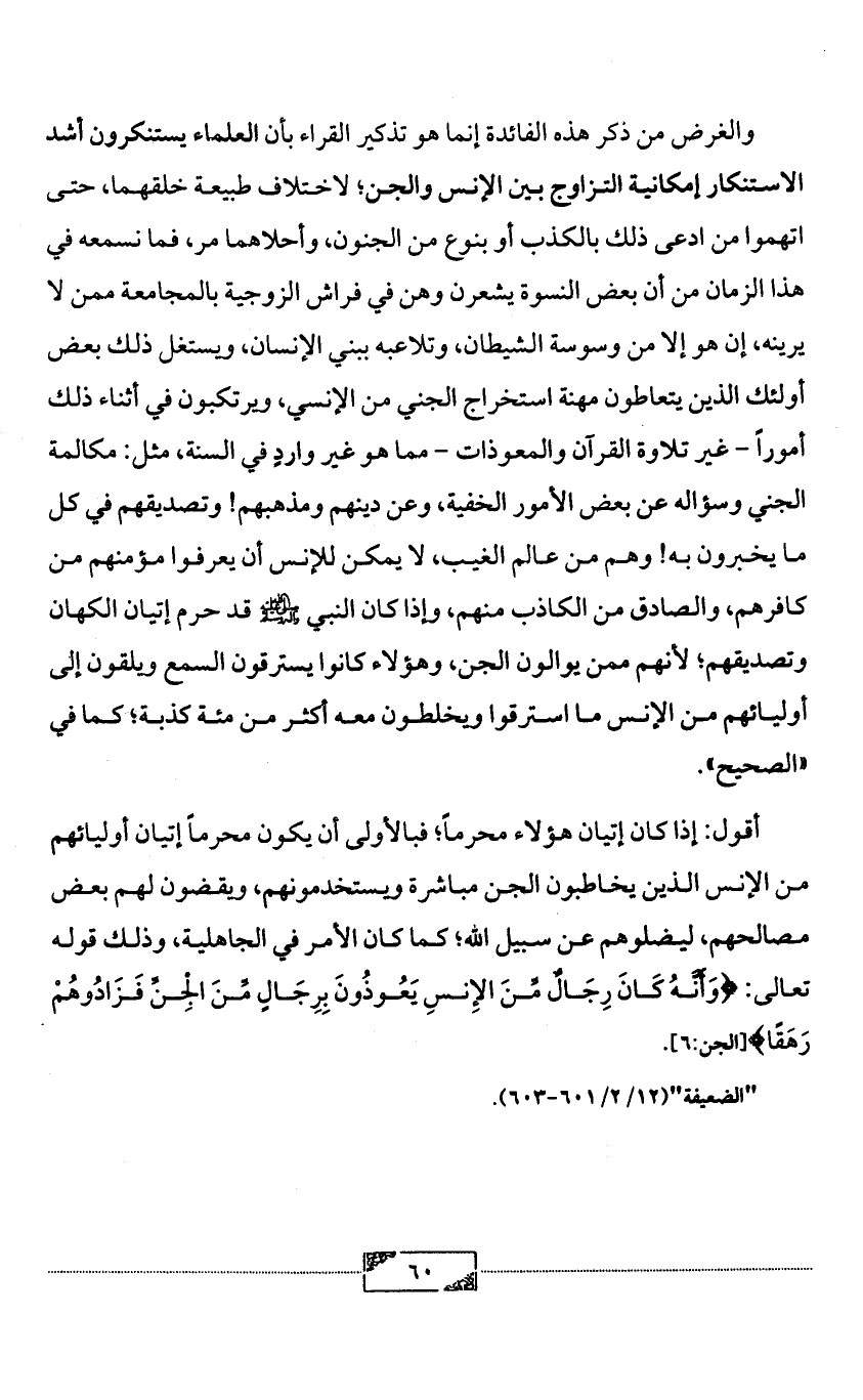 والغرض من ذكر هذه الفائدة إنما هو تذكير القراء بأن العلماء يستنكرون أشد الاستنكار إمكانية التزاوج بين الإنس والجن؛ لاختلاف طبيعة خلقهما، حتى اتهموا من ادعى ذلك بالكذب أو بنوع من الجنون، وأحلاهما مر, فما نسمعه في هذا الزمان من أن بعض النسوة يشعرن وهن في فراش الزوجية بالمجامعة ممن لا يرينه، إن هو إلا من وسوسة الشيطان، وتلاعبه ببني الإنسان، ويستغل ذلك بعض أولئك الذين يتعاطون مهنة استخراج الجني من الإنسي، ويرتكبون في أثناء ذلك أموراً - غير تلاوة القرآن والمعوذات - مما هو غير واردٍ في السنة، مثل: مكالمة الجني وسؤاله عن بعض الأمور الخفية، وعن دينهم ومذهبهم! وتصديقهم في كل ما يخبرون به! وهم من عالم الغيب، لا يمكن للإنس أن يعرفوا مؤمنهم من كافرهم، والصادق من الكاذب منهم، وإذا كان النبي - صلى الله عليه وآله وسلم - قد حرم إتيان الكهان وتصديقهم؛ لأنهم ممن يوالون الجن، وهؤلاء كانوا يسترقون السمع ويلقون إلى أوليائهم من الإنس ما استرقوا ويخلطون معه أكثر من مئة كذبة؛ كما في «الصحيح».