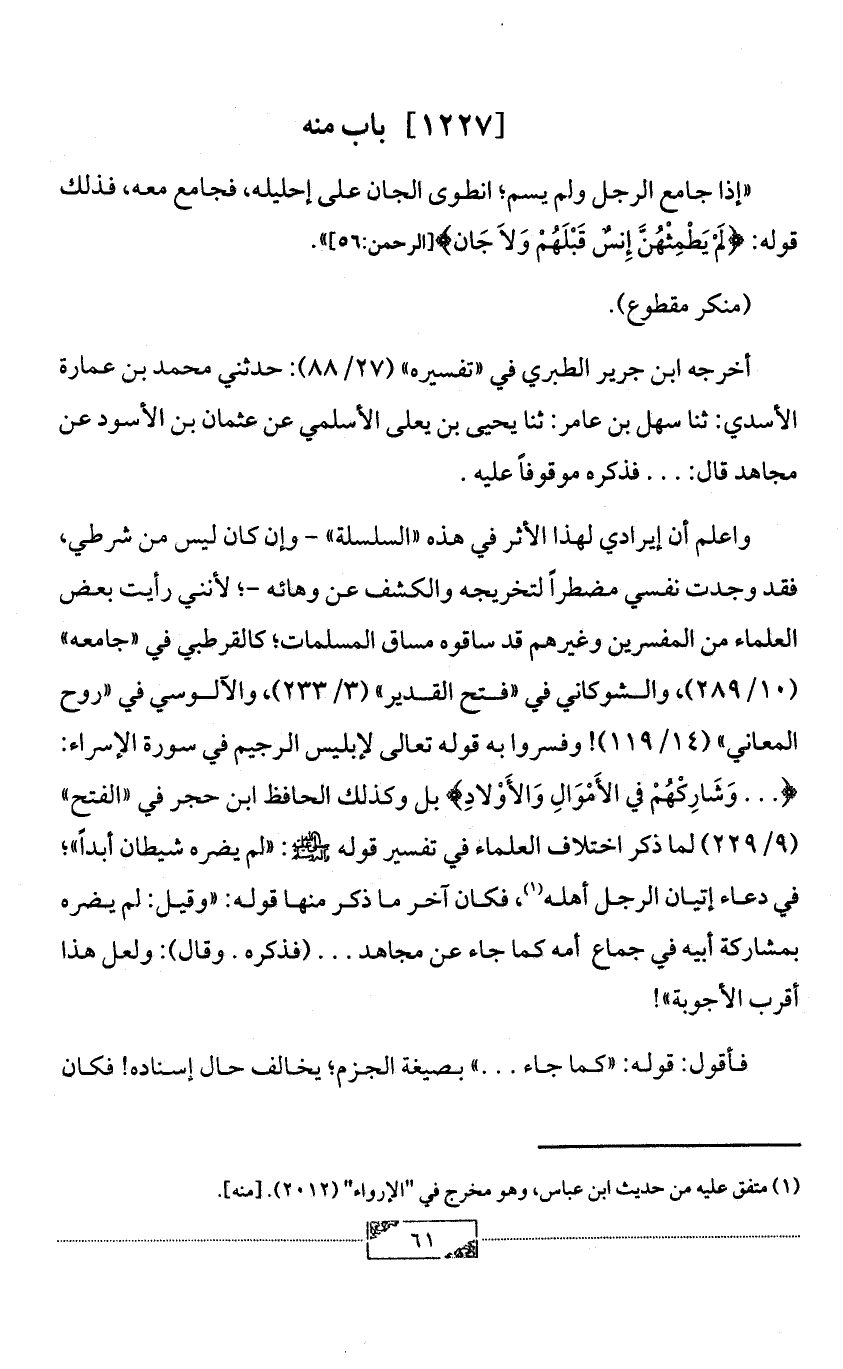 واعلم أن إيرادي لهذا الأثر في هذه «السلسلة» - وإن كان ليس من شرطي، فقد وجدت نفسي مضطراً لتخريجه والكشف عن وهائه -؛ لأنني رأيت بعض العلماء من المفسرين وغيرهم قد ساقوه مساق المسلمات؛ كالقرطبي في «جامعه» (10/ 289)، والشوكاني في «فتح القدير» (3/ 233)، والآلوسي في «روح المعاني» (14/ 119)! وفسروا به قوله تعالى لإبليس الرجيم في سورة الإسراء: {. . . وَشَارِكْهُمْ في الأَمْوَالِ وَالأَوْلادِ} بل وكذلك الحافظ ابن حجر في «الفتح» (9/ 229) لما ذكر اختلاف العلماء في تفسير قوله - صلى الله عليه وآله وسلم -: «لم يضره شيطان أبداً»؛ في دعاء إتيان الرجل أهله (¬1)، فكان آخر ما ذكر منها قوله: «وقيل: لم يضره بمشاركة أبيه في جماع أمه كما جاء عن مجاهد. . . (فذكره. وقال): ولعل هذا أقرب الأجوبة»!