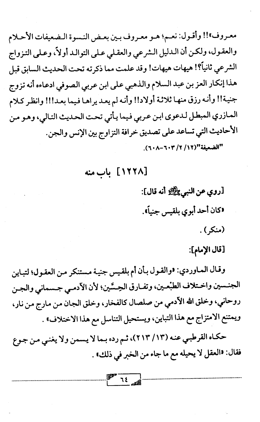 معروف»!! وأقول: نعم؛ هو معروف بين بعض النسوة الضعيفات الأحلام والعقول، ولكن أن الدليل الشرعي والعقلي على التوالد أولاً، وعلى التزواج الشرعي ثانياً؟! هيهات هيهات! وقد علمت مما ذكرته تحت الحديث السابق قبل هذا إنكار العز بن عبد السلام والذهبي على ابن عربي الصوفي ادعاءه أنه تزوج جنية!! وأنه رزق منها ثلاثة أولاد!! وأنه لم يعد يراها فيما بعد!!! وانظر كلام المازري المبطل لدعوى ابن عربي فيما يأتي تحت الحديث التالي، وهو من الأحاديث التي تساعد على تصديق خرافة التزاوج بين الإنس والجن.