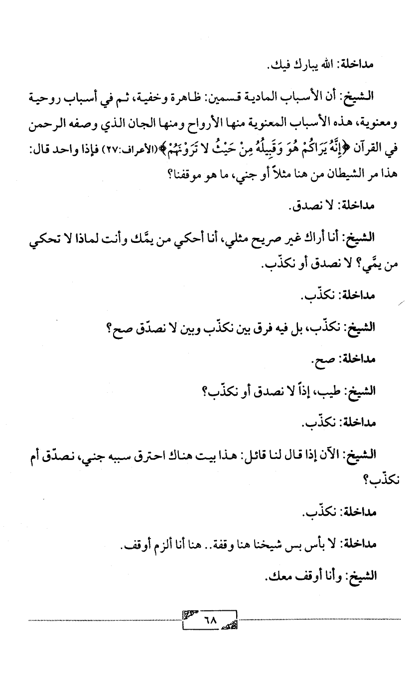 الشيخ: أن الأسباب المادية قسمين: ظاهرة وخفية، ثم في أسباب روحية ومعنوية، هذه الأسباب المعنوية منها الأرواح ومنها الجان الذي وصفه الرحمن في القرآن {إِنَّهُ يَرَاكُمْ هُوَ وَقَبِيلُهُ مِنْ حَيْثُ لا تَرَوْنَهُمْ} (الأعراف:27) فإذا واحد قال: هذا مر الشيطان من هنا مثلاً أو جني، ما هو موقفنا؟