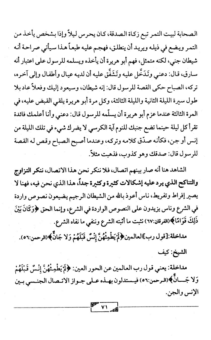 مداخلة: يعني قول رب العالمين عن الحور العين: {لَمْ يَطْمِثْهُنَّ إِنْسٌ قَبْلَهُمْ وَلا جَانٌّ} (الرحمن:56) فيستدلون بهذه على جواز الاتصال الجنسي بين الإنس والجن.
