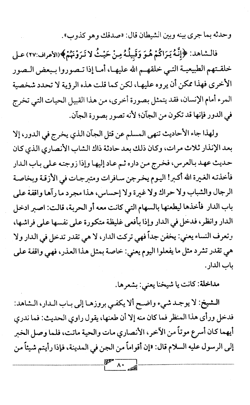 ولهذا جاء الأحاديث تنهى المسلم عن قتل الجآن الذي يخرج في الدور، إلا بعد الإنذار ثلاث مرات، وكان ذلك بعد حادثة ذاك الشاب الأنصاري الذي كان حديث عهد بالعرس، فخرج من داره ثم عاد إليها وإذا زوجته على باب الدار فأخذته الغيرة الله أكبر! اليوم يخرجن سافرات ومتبرجات في الأزقة وبخاصة الرجال والشباب ولا حراك ولا غيرة ولا إحساس، هذا مجرد ما رآها واقفة على باب الدار فأخذها ليطعنها بالسهام التي كانت معه أو الحربة، قالت: اصبر ادخل الدار وانظر، فدخل في الدار وإذا بأفعى غليظة متكورة على نفسها على فراشها، وتعرف النساء يعني: يخفن جداً فهي تركت الدار، لا هي تقدر تدخل في الدار ولا هي تقدر تشرد مثل ما يفعلوا اليوم يعني: خاصة بمثل هذا العذر، فهي واقفة على باب الدار.