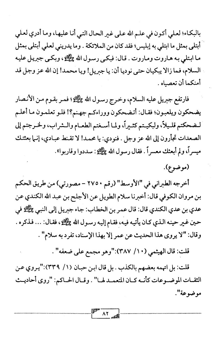 فارتفع جبريل عليه السلام، وخرج رسول الله - صلى الله عليه وآله وسلم -؛ فمر بقوم من الأنصار يضحكون ويلعبون؛ فقال: أتضحكون ووراءكم جهنم؟! فلو تعلمون ما أعلم لضحكتم قليلاً، ولبكيتم كثيراً، ولما أسغتم الطعام والشراب، ولخرجتم إلى الصعدات تجأرون إلى الله عز وجل. فنودي: يا محمد! لا تقنط عبادي، إنما بعثتك ميسراً، ولم أبعثك معسراً. فقال رسول الله - صلى الله عليه وآله وسلم -: سددوا وقاربوا».