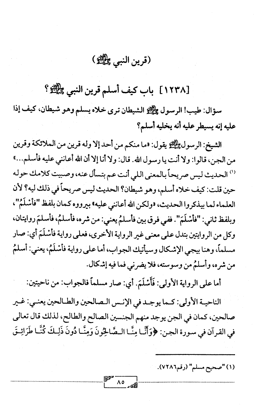 الشيخ: الرسول - صلى الله عليه وآله وسلم - يقول: «ما منكم من أحد إلا وله قرين من الملائكة وقرين من الجن، قالوا: ولا أنت يا رسول الله. قال: ولا أنا إلا أن الله أعانني عليه فأسلم ... » (¬1) الحديث ليس صريحاً بالمعنى اللي أنت عم بتسأل عنه، وصبيت كلامك حوله حين قلت: كيف خلاه أسلم، وهو شيطان؟ الحديث ليس صريحاً في ذلك ليه؟ لأن العلماء لما بيذكروا الحديث، «ولكن الله أعانني عليه» بيرووه كمان بلفظ "فأسْلَمُ"، وبلفظ ثاني: "فأسْلَمَ". ففي فرق بين فأسلمُ يعني: من شره، فأسلمُ، فأسلمَ روايتان، وكل من الروايتين بتدل على معنى غير الرواية الأخرى، فعلى رواية فأسْلَمَ أي: صار مسلماً، وهنا بيجي الإشكال وسيأتيك الجواب، أما على رواية فأسْلَمُ، يعني: أسلمُ من شره، وأسلمُ من وسوسته، فلا يضرني فما فيه إشكال.
