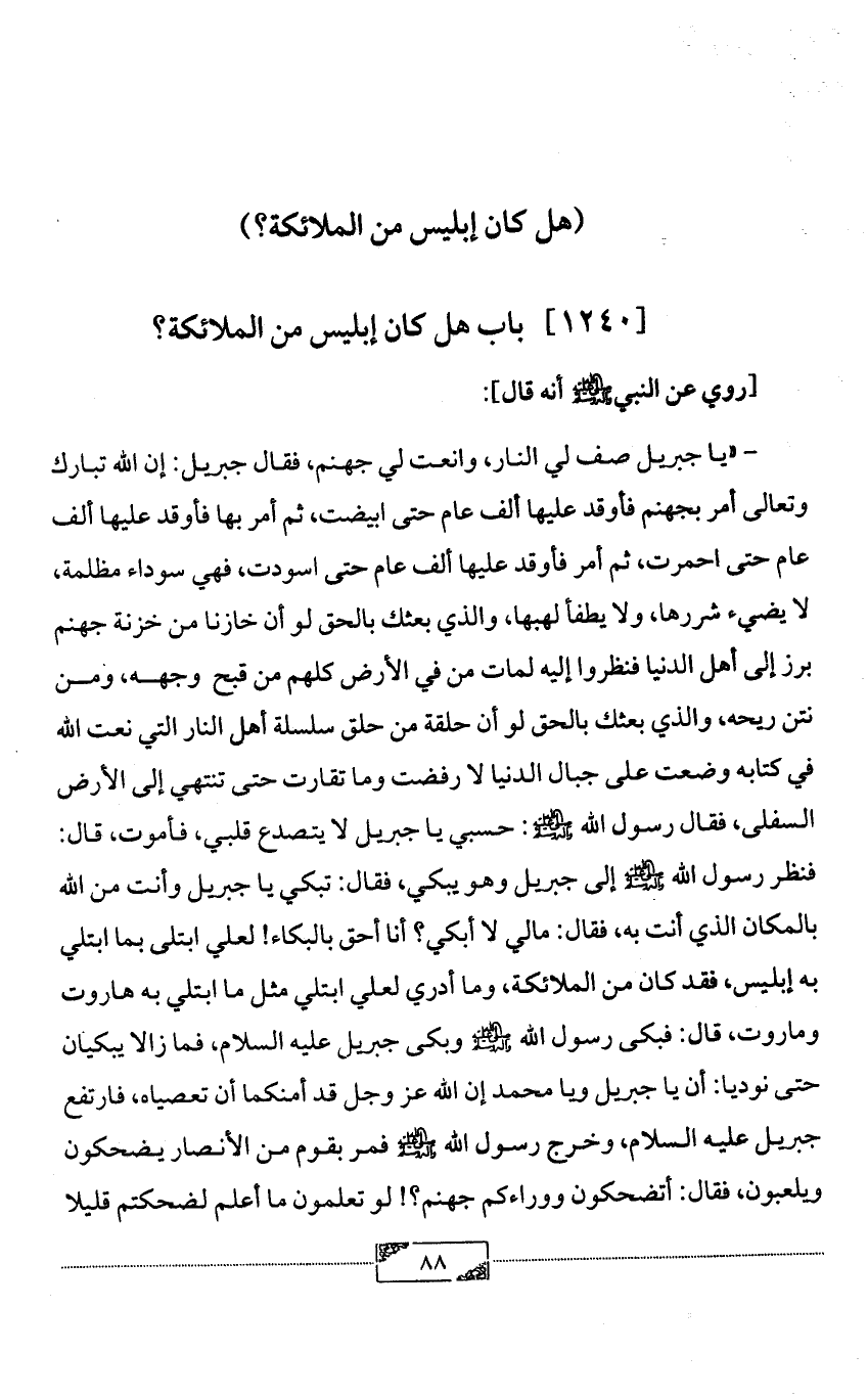 - «يا جبريل صف لي النار، وانعت لي جهنم، فقال جبريل: إن الله تبارك وتعالى أمر بجهنم فأوقد عليها ألف عام حتى ابيضت، ثم أمر بها فأوقد عليها ألف عام حتى احمرت، ثم أمر فأوقد عليها ألف عام حتى اسودت، فهي سوداء مظلمة، لا يضيء شررها، ولا يطفأ لهبها، والذي بعثك بالحق لو أن خازنا من خزنة جهنم برز إلى أهل الدنيا فنظروا إليه لمات من في الأرض كلهم من قبح وجهه، ومن نتن ريحه، والذي بعثك بالحق لو أن حلقة من حلق سلسلة أهل النار التي نعت الله في كتابه وضعت على جبال الدنيا لا رفضت وما تقارت حتى تنتهي إلى الأرض السفلى، فقال رسول الله - صلى الله عليه وآله وسلم -: حسبي يا جبريل لا يتصدع قلبي، فأموت، قال: فنظر رسول الله - صلى الله عليه وآله وسلم - إلى جبريل وهو يبكي، فقال: تبكي يا جبريل وأنت من الله بالمكان الذي أنت به، فقال: مالي لا أبكي؟ أنا أحق بالبكاء! لعلي ابتلى بما ابتلي به إبليس، فقد كان من الملائكة، وما أدري لعلي ابتلي مثل ما ابتلي به هاروت وماروت، قال: فبكى رسول الله - صلى الله عليه وآله وسلم - وبكى جبريل عليه السلام، فما زالا يبكيان حتى نوديا: أن يا جبريل ويا محمد إن الله عز وجل قد أمنكما أن تعصياه، فارتفع جبريل عليه السلام، وخرج رسول الله - صلى الله عليه وآله وسلم - فمر بقوم من الأنصار يضحكون ويلعبون، فقال: أتضحكون ووراءكم جهنم؟! لو تعلمون ما أعلم لضحكتم قليلا