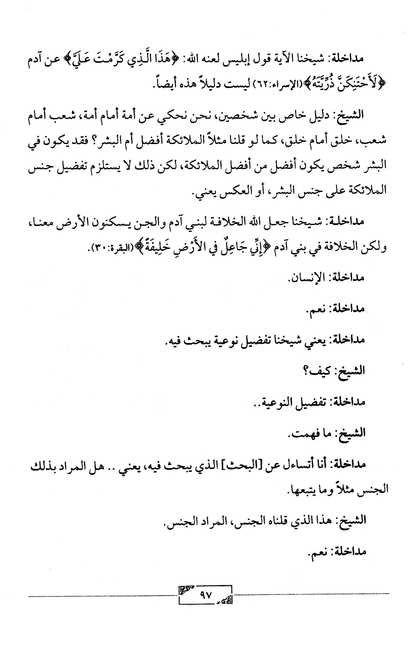 الشيخ: دليل خاص بين شخصين، نحن نحكي عن أمة أمام أمة، شعب أمام شعب، خلق أمام خلق، كما لو قلنا مثلاً الملائكة أفضل أم البشر؟ فقد يكون في البشر شخص يكون أفضل من أفضل الملائكة، لكن ذلك لا يستلزم تفضيل جنس الملائكة على جنس البشر، أو العكس يعني.