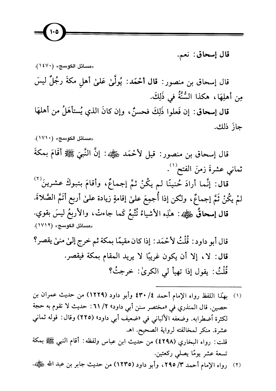 قال أبو داود: قُلْتُ لأحْمَد: إذا كان مقيمًا بمكة ثم خرج إلى منى يقصر؟