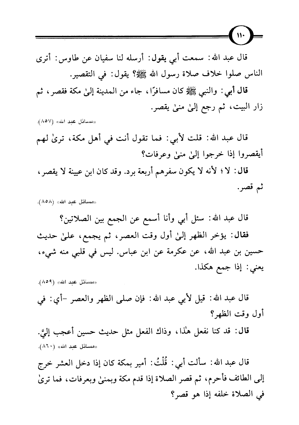 قال عبد اللَّه: قلت لأبي: فما تقول أنت في أهل مكة، ترى لهم أيقصروا إذا خرجوا إلى منى وعرفات؟