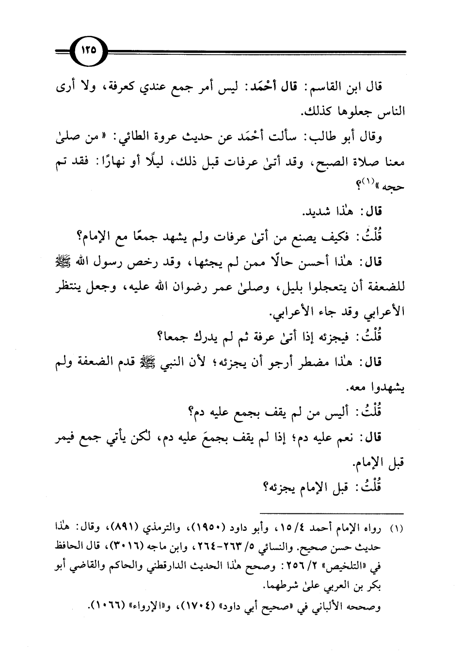 وقال أبو طالب: سألت أحْمَد عن حديث عروة الطائي: "من صلى معنا صلاة الصبح، وقد أتى عرفات قبل ذلك، ليلًا أو نهارًا: فقد تم حجه" (¬1)؟