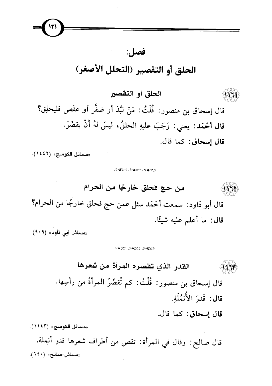 قال إسحاق بن منصور: قُلْتُ: كم تُقصِّرُ المرأةُ من رأسِها.