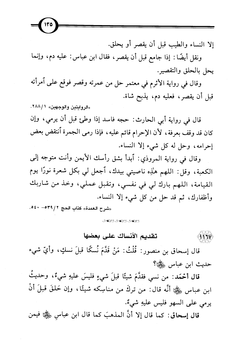 قال إسحاق بن منصور: قُلْتُ: مَنْ قَدَّمَ نُسكًا قبلَ نسكٍ، وأيّ شيء حديث ابن عباس -رضي اللَّه عنهما-؟