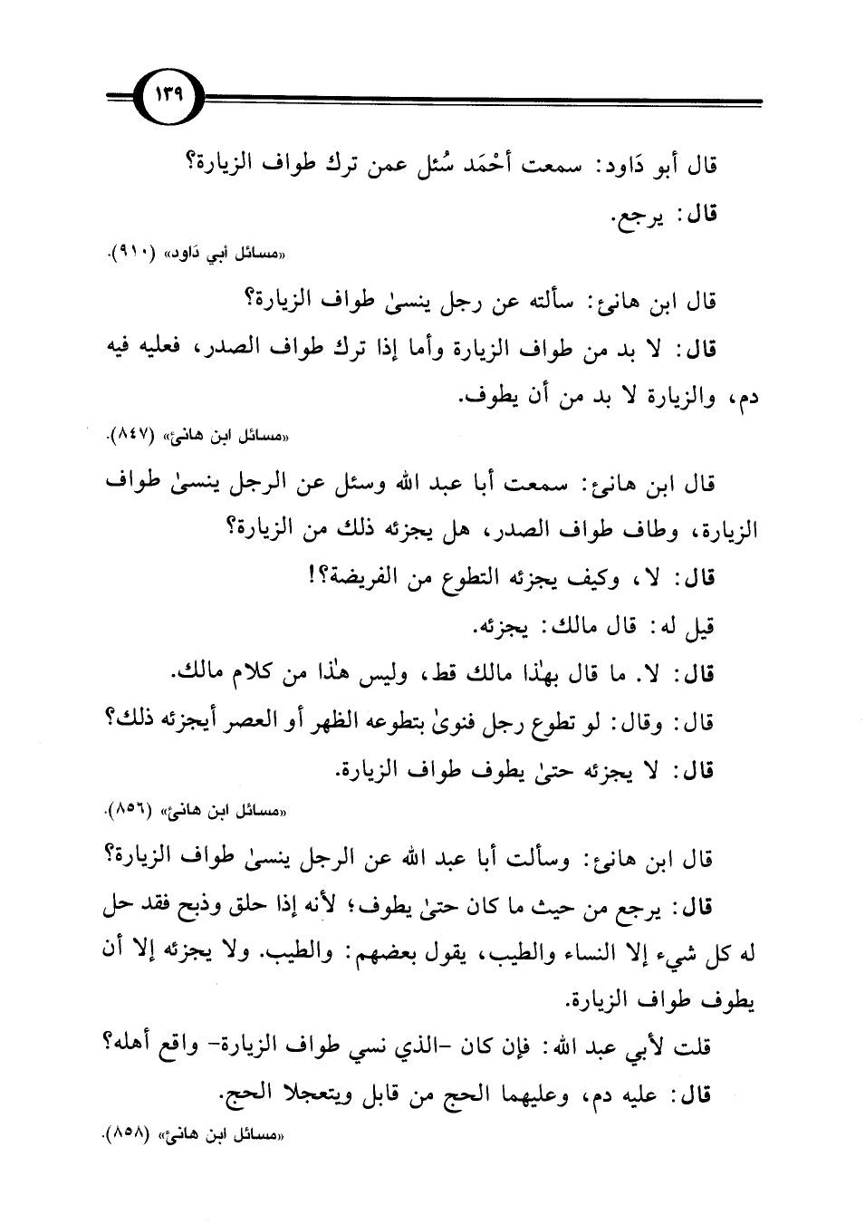 قال ابن هانئ: وسألت أبا عبد اللَّه عن الرجل ينسى طواف الزيارة؟