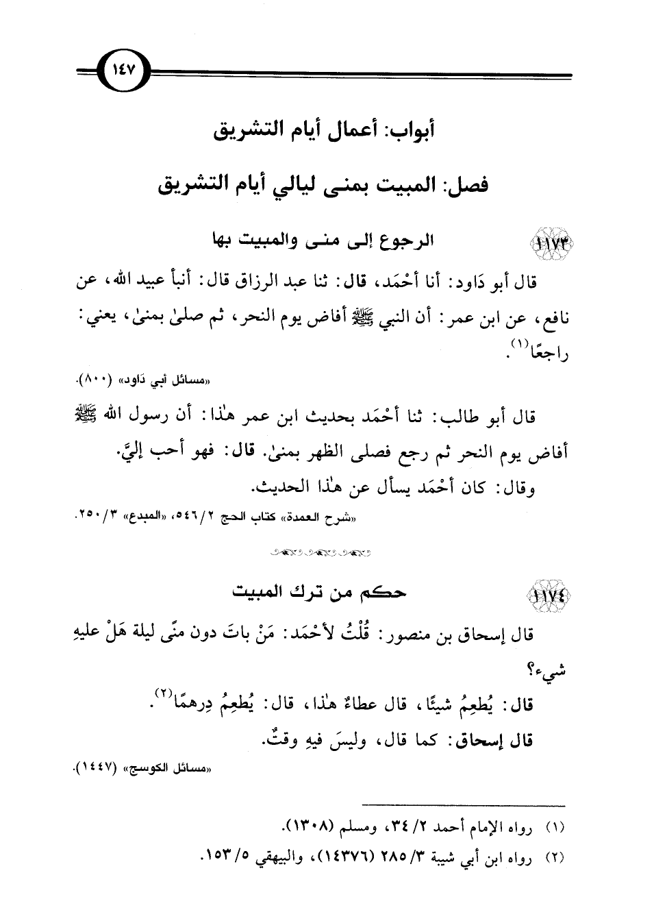 قال إسحاق بن منصور: قُلْتُ لأحْمَد: مَنْ باتَ دون منًى ليلة هَلْ عليهِ شيء؟