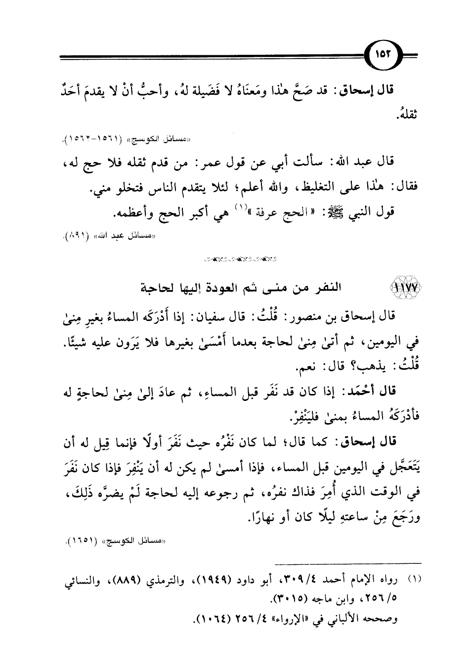 قال إسحاق: كما قال: لما كان نَفْرُه حيث نَفَرَ أولًا فإنما قِيل له أن يَتَعَجَّل في اليومين قبل المساء، فإذا أمسى لم يكن له أن يَنْفِرَ فإذا كان نَفَرَ في الوقت الذي أُمِرَ فذاك نفرُه، ثم رجوعه إليه لحاجة لَمْ يضرَّه ذَلِكَ، ورَجَعَ مِنْ ساعتهِ ليلًا كان أو نهارًا.