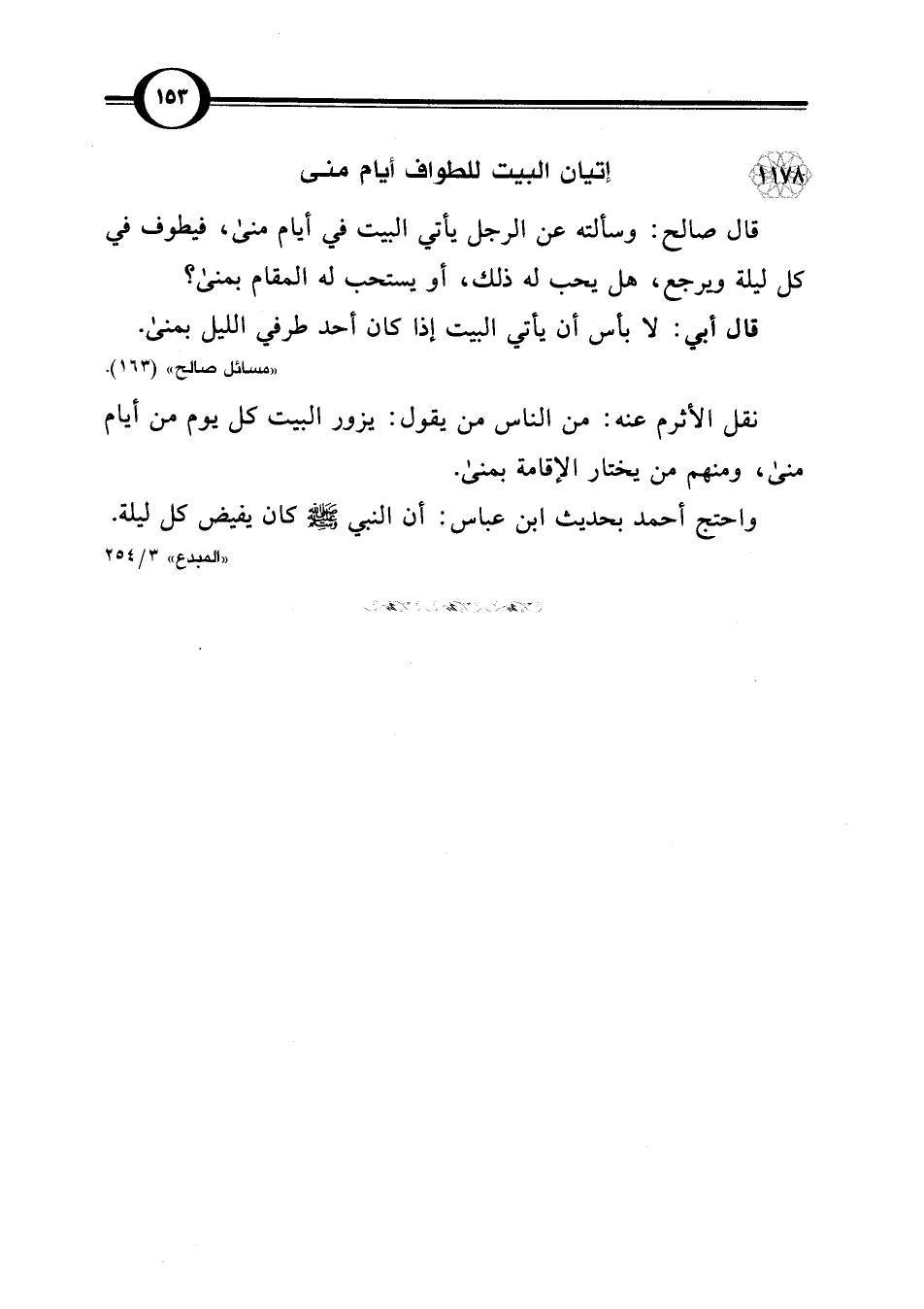 قال صالح: وسألته عن الرجل يأتي البيت في أيام منى، فيطوف في كل ليلة ويرجع، هل يحب له ذلك، أو يستحب له المقام بمنى؟