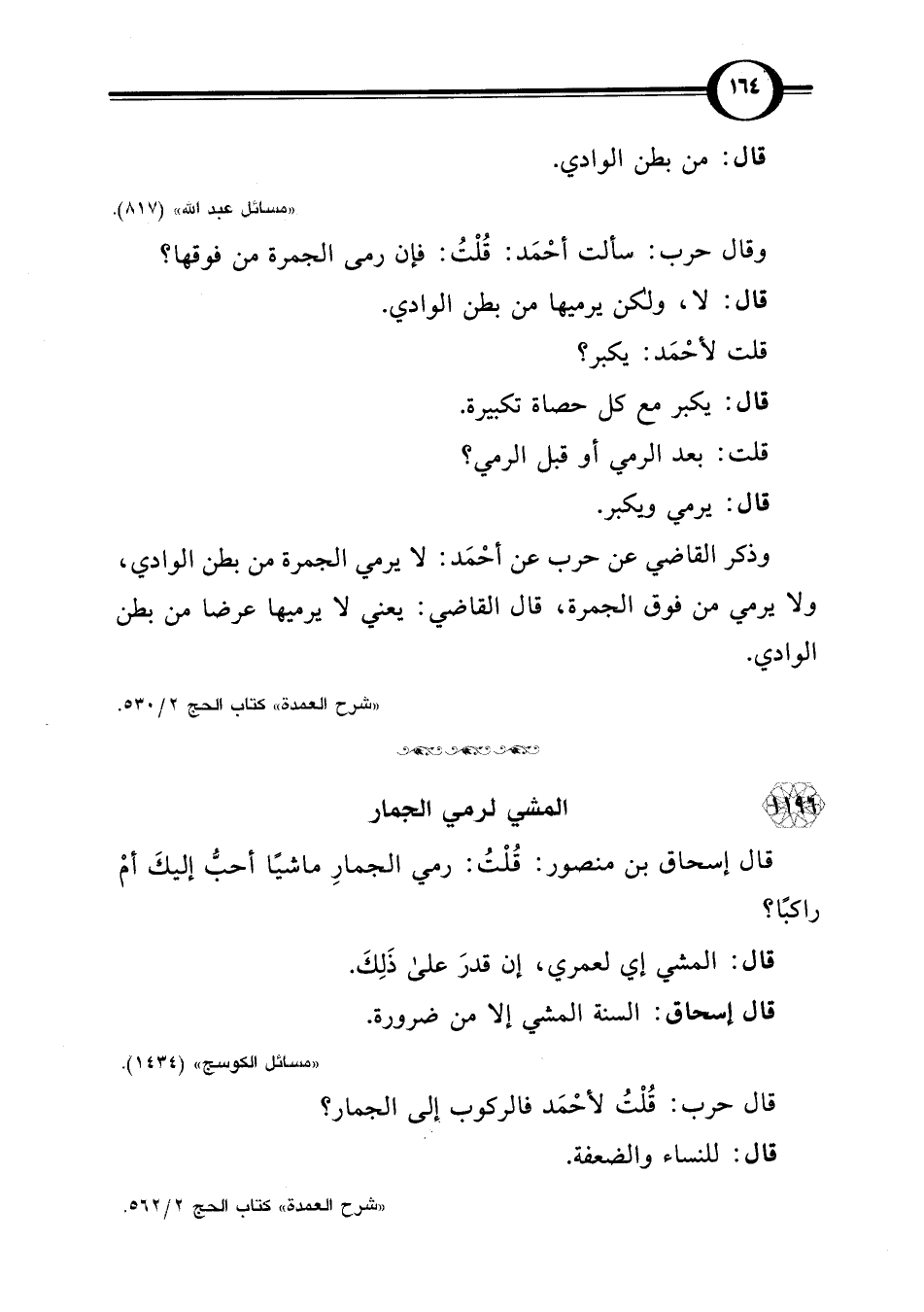 قال إسحاق بن منصور: قُلْتُ: رمي الجمارِ ماشيًا أحبُّ إليكَ أمْ راكبًا؟