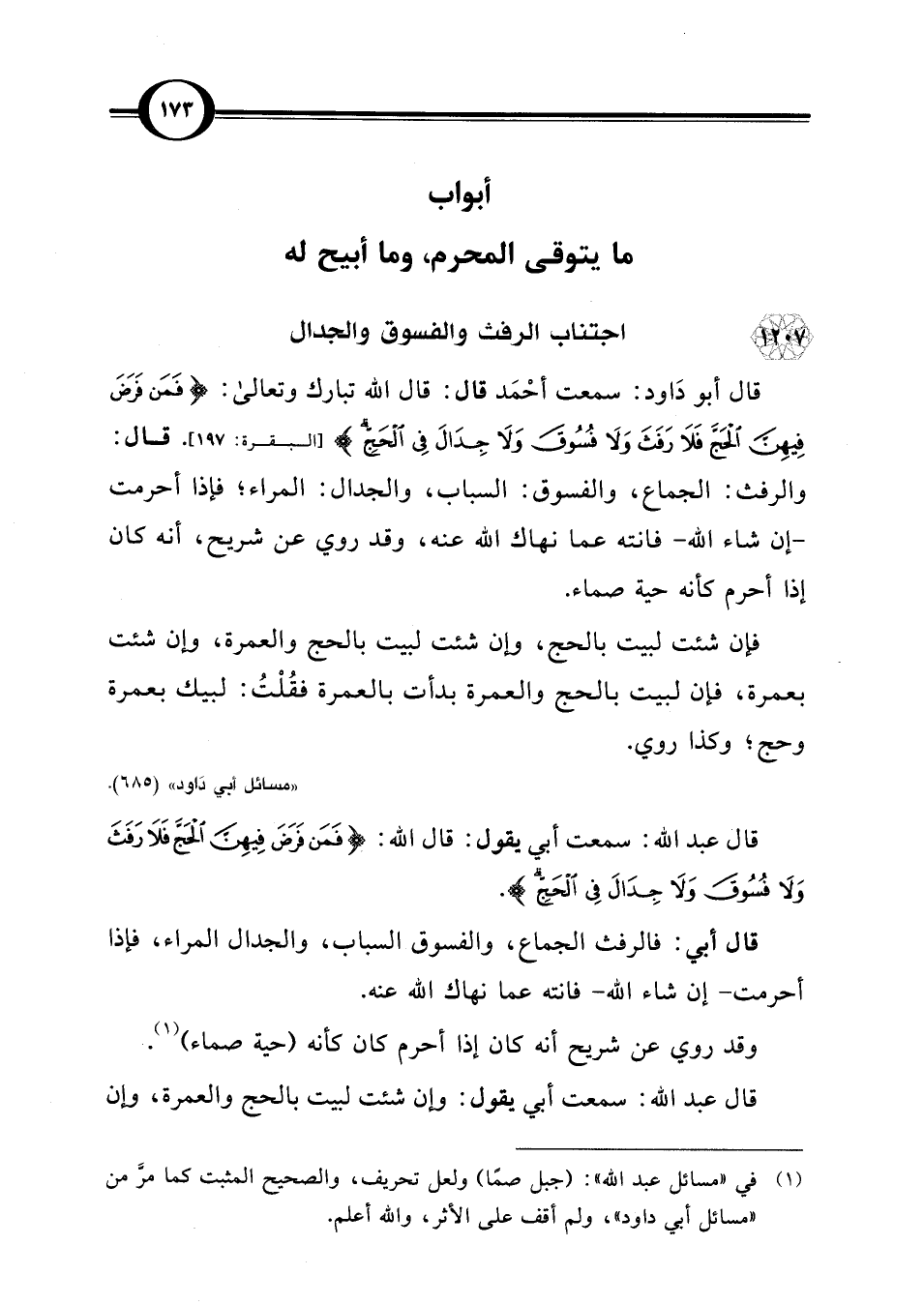 قال أبو داود: سمعت أحْمَد قال: قال اللَّه تبارك وتعالى: {فَمَنْ فَرَضَ فِيهِنَّ الْحَجَّ فَلَا رَفَثَ وَلَا فُسُوقَ وَلَا جِدَالَ فِي الْحَجِّ} [البقرة: 197]. قال: والرفث: الجماع، والفسوق: السباب، والجدال: المراء؛ فإذا أحرمت -إن شاء اللَّه- فانته عما نهاك اللَّه عنه، وقد روي عن شريح، أنه كان إذا أحرم كأنه حية صماء.