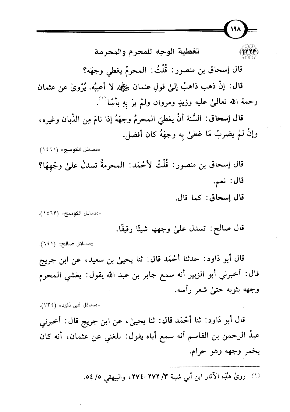 قال أبو داود: ثنا أحْمَد قال: ثنا يحيى، عن ابن جريج قال: أخبرني عبدُ الرحمن بن القاسم أنه سمع أباه يقول: بلغني عن عثمان، أنه كان يخمر وجهه وهو حرام.