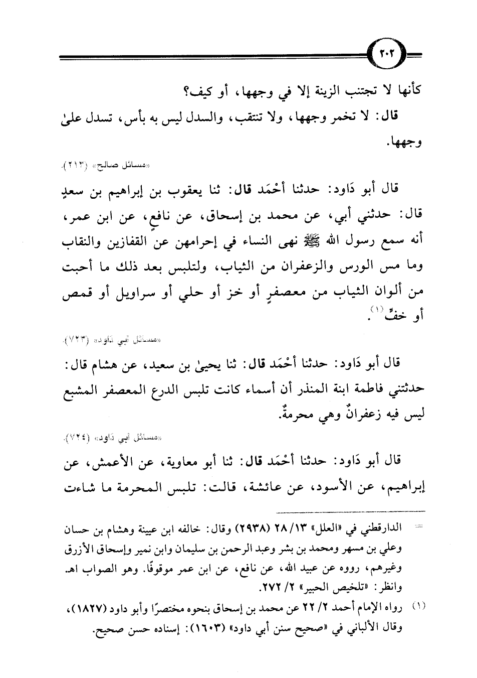 قال أبو داود: حدثنا أحْمَد قال: ثنا أبو معاوية، عن الأعمش، عن إبراهيم، عن الأسود، عن عائشة، قالت: تلبس المحرمة ما شاءت
