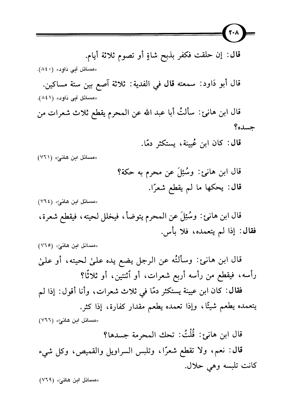 قال ابن هانئ: سألتُ أبا عبد اللَّه عن المحرم يقطع ثلاث شعرات من جسده؟