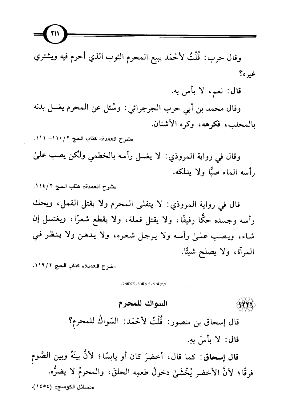 قال إسحاق بن منصور: قُلْتُ لأحْمَد: السّواكُ للمحرمِ؟