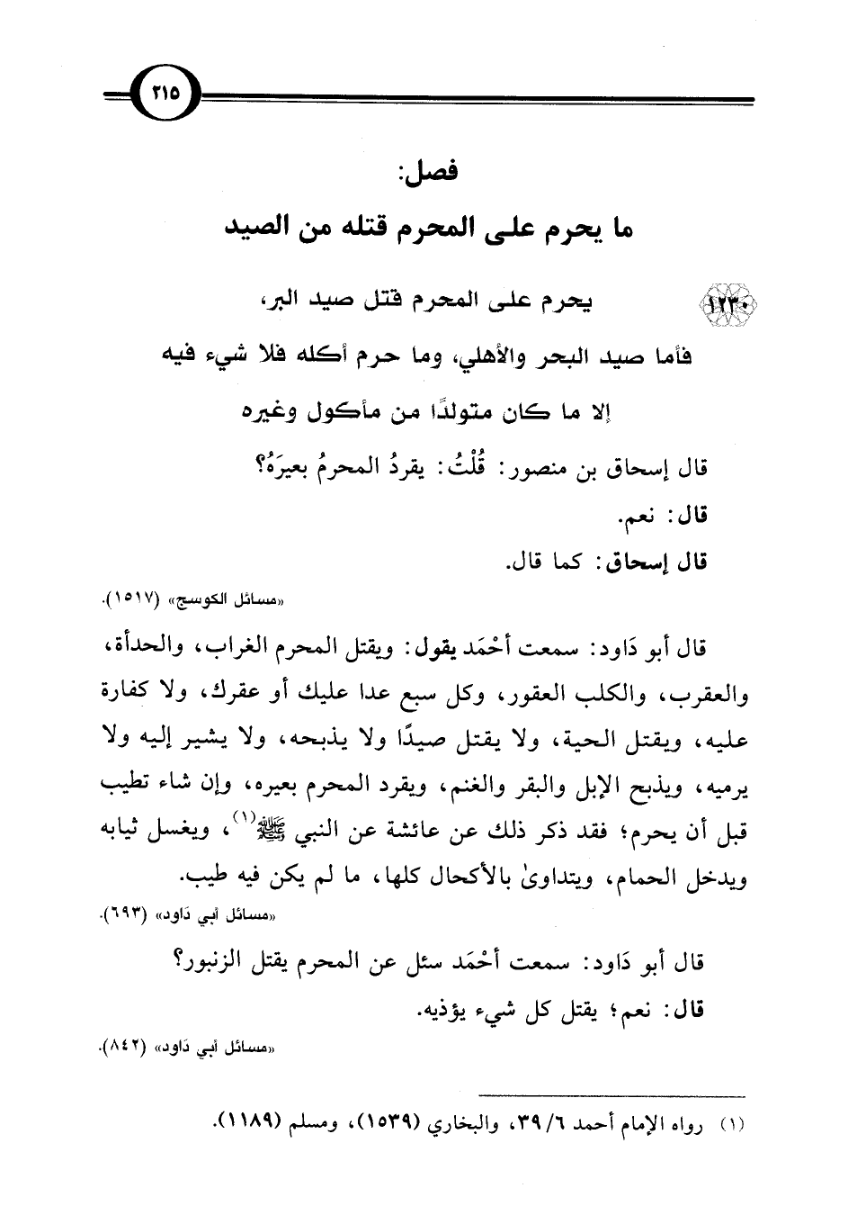 1230 - يحرم على المحرم قتل صيد البر، فأما صيد البحر والأهلي، وما حرم أكله فلا شيء فيه إلا ما كان متولدًا من مأكول وغيره