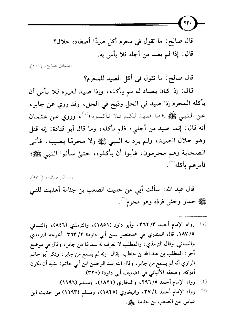 قال عبد اللَّه: سألت أبي عن حديث الصعب بن جثامة أهديت للنبي -صلى اللَّه عليه وسلم- حمار وحش فردّه وهو محرم (¬3).