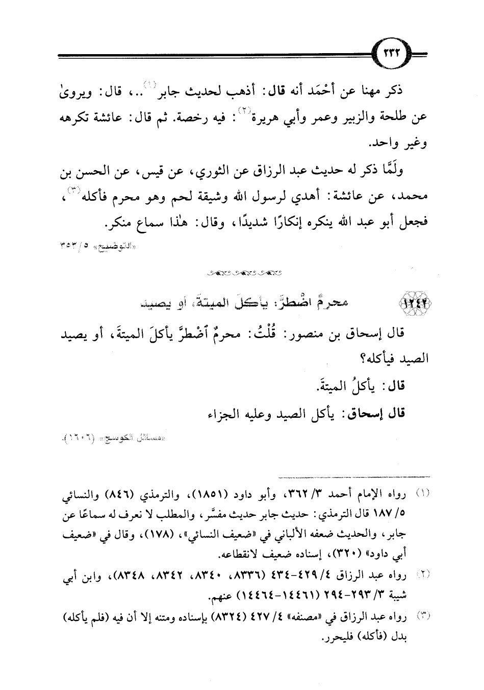 قال إسحاق بن منصور. قُلْتُ: محرمٌ اضْطرَّ يأكلَ الميتةَ، أو يصيد الصيد فيأكله؟