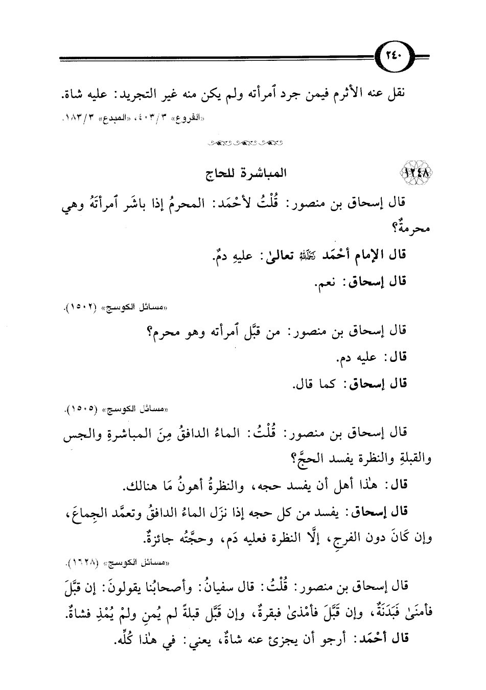 قال إسحاق بن منصور: قُلْتُ: الماءُ الدافقُ مِنَ المباشرةِ والجس والقبلةِ والنظرة يفسد الحجَّ؟