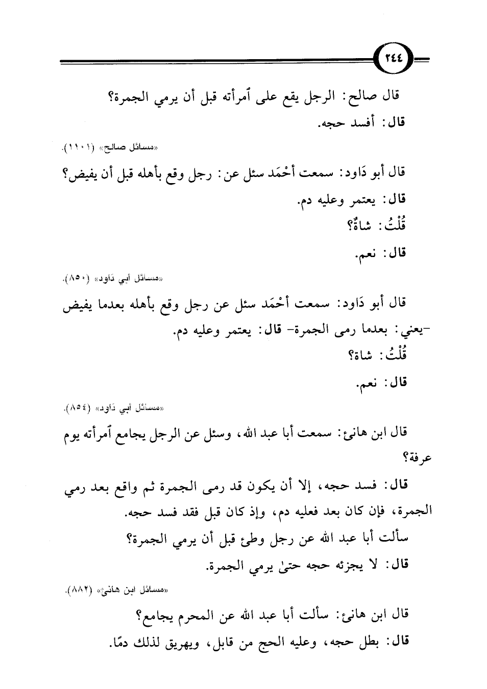 قال أبو داود: سمعت أحْمَد سئل عن: رجل وقع بأهله قبل أن يفيض؟