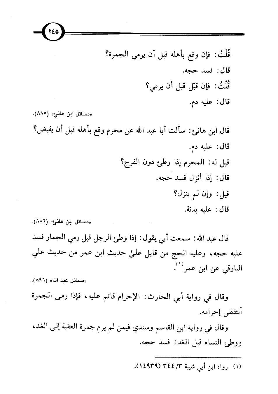 قال ابن هانئ: سألت أبا عبد اللَّه عن محرم وقع بأهله قبل أن يفيض؟