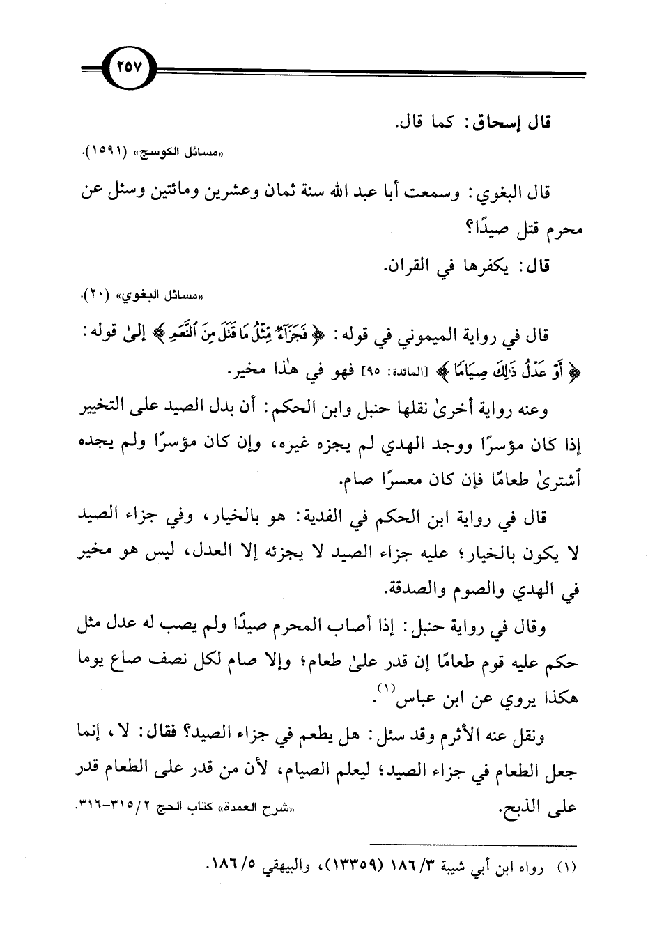 قال البغوي: وسمعت أبا عبد اللَّه سنة ثمان وعشرين ومائتين وسئل عن محرم قتل صيدًا؟