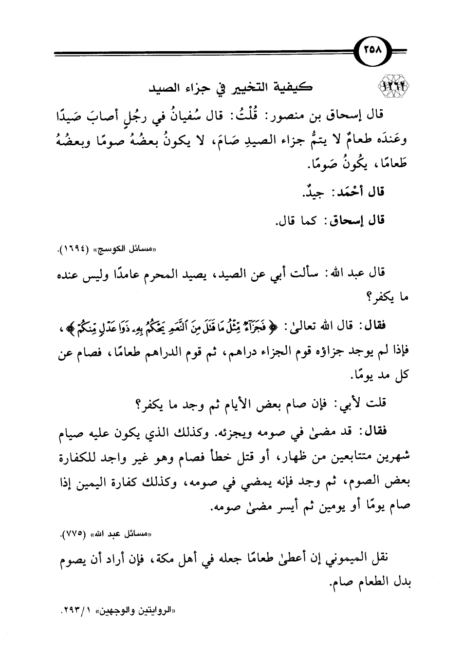 قال إسحاق بن منصور: قُلْتُ: قال سُفيانُ في رجُلٍ أصابَ صَيدًا وعَندَه طعامٌ لا يتمُّ جزاء الصيدِ صَامَ، لا يكونُ بعضُهُ صومًا وبعضُهُ طَعامًا، يكُونُ صَومًا.