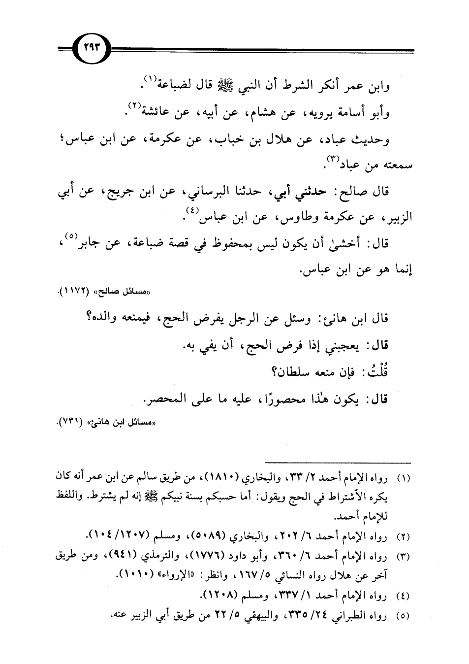 (¬1) رواه الإمام أحمد 2/ 33، والبخاري (1810)، من طريق سالم عن ابن عمر أنه كان يكره الاشتراط في الحج ويقول: أما حسبكم بسنة نبيكم -صلى اللَّه عليه وسلم- إنه لم يشترط. واللفظ للإمام أحمد.