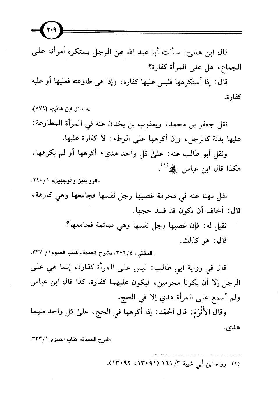 قال ابن هانئ: سألت أبا عبد اللَّه عن الرجل يستكره امرأته على الجماع، هل على المرأة كفارة؟