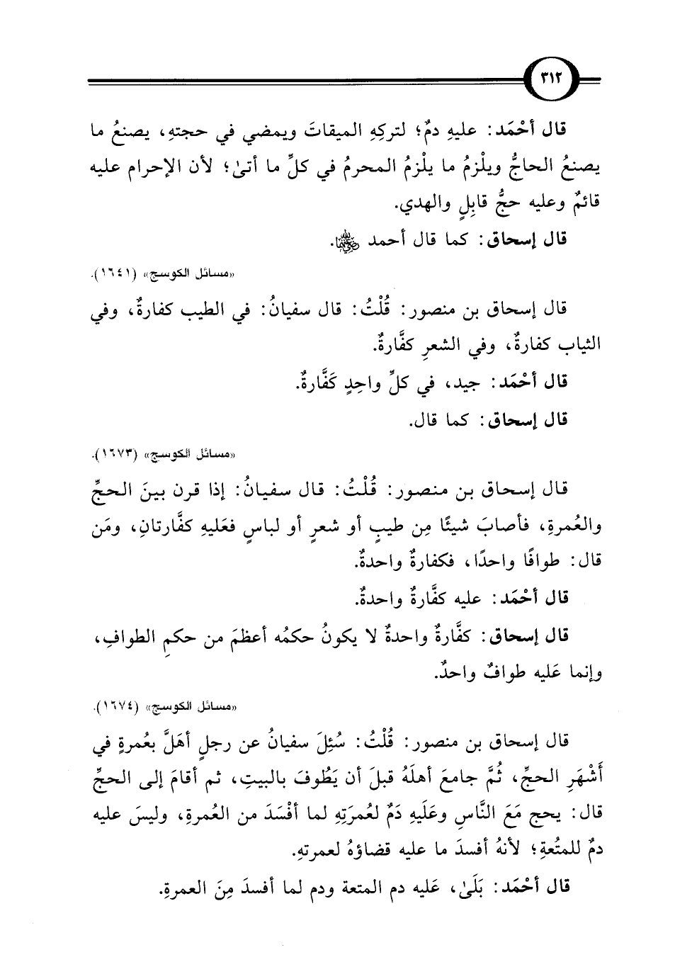 قال إسحاق بن منصور: قُلْتُ: قال سفيانُ: في الطيب كفارةٌ، وفي الثياب كفارةٌ، وفي الشعرِ كفَّارةٌ.
