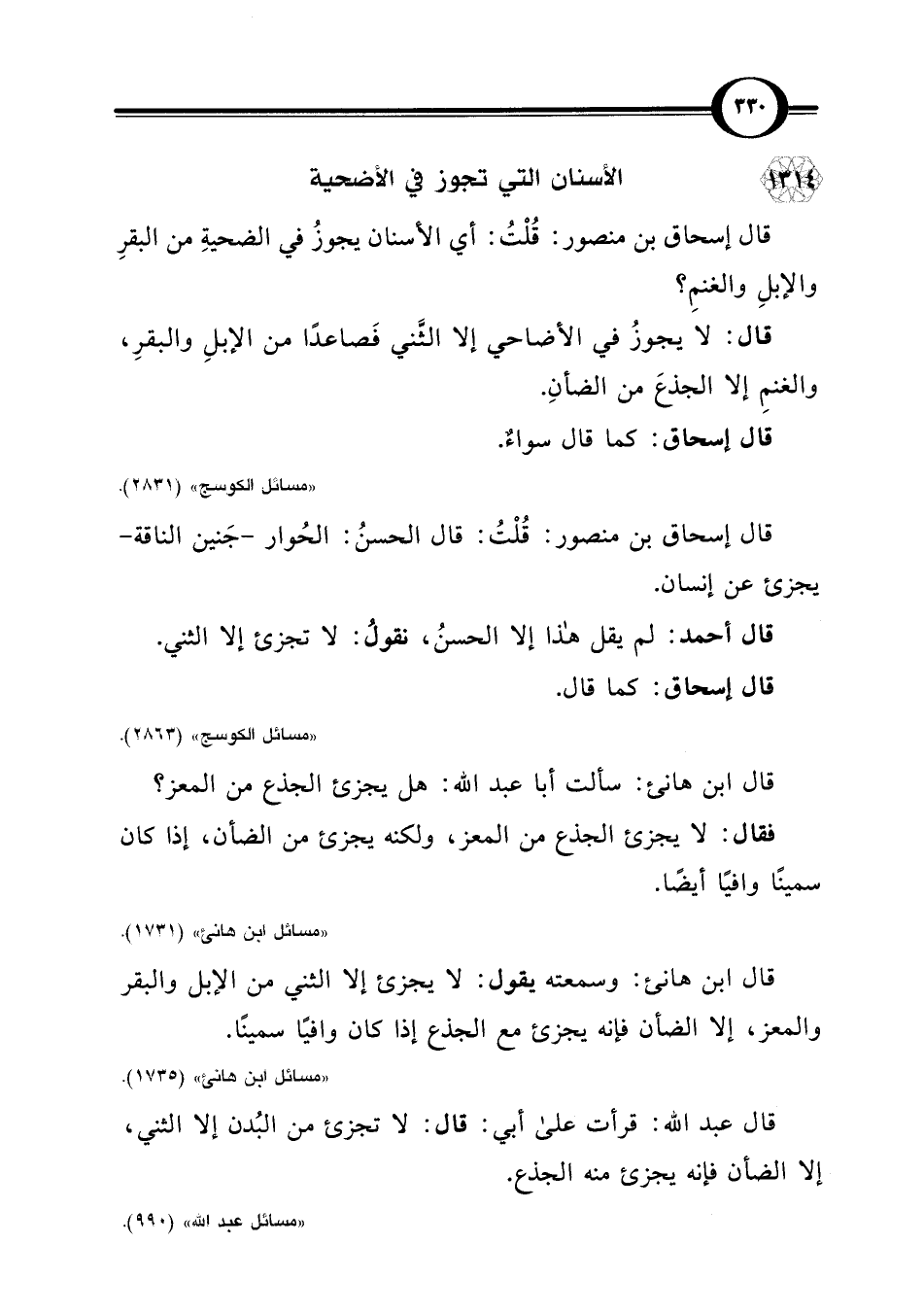 قال إسحاق بن منصور: قُلْتُ: أي الأسنان يجوزُ في الضحيةِ من البقرِ والإبلِ والغنمِ؟