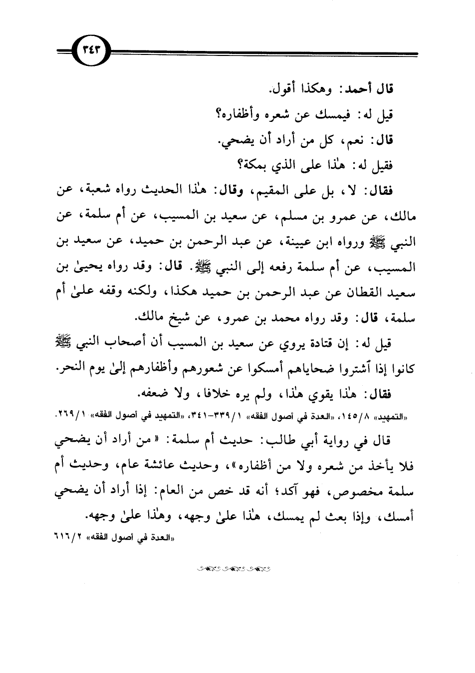 قال في رواية أبي طالب: حديث أم سلمة: "من أراد أن يضحي فلا يأخذ من شعره ولا من أظفاره"، وحديث عائشة عام، وحديث أم سلمة مخصوص، فهو آكد؛ أنه قد خص من العام: إذا أراد أن يضحي أمسك، وإذا بعث لم يمسك، هذا على وجهه، وهذا على وجهه.