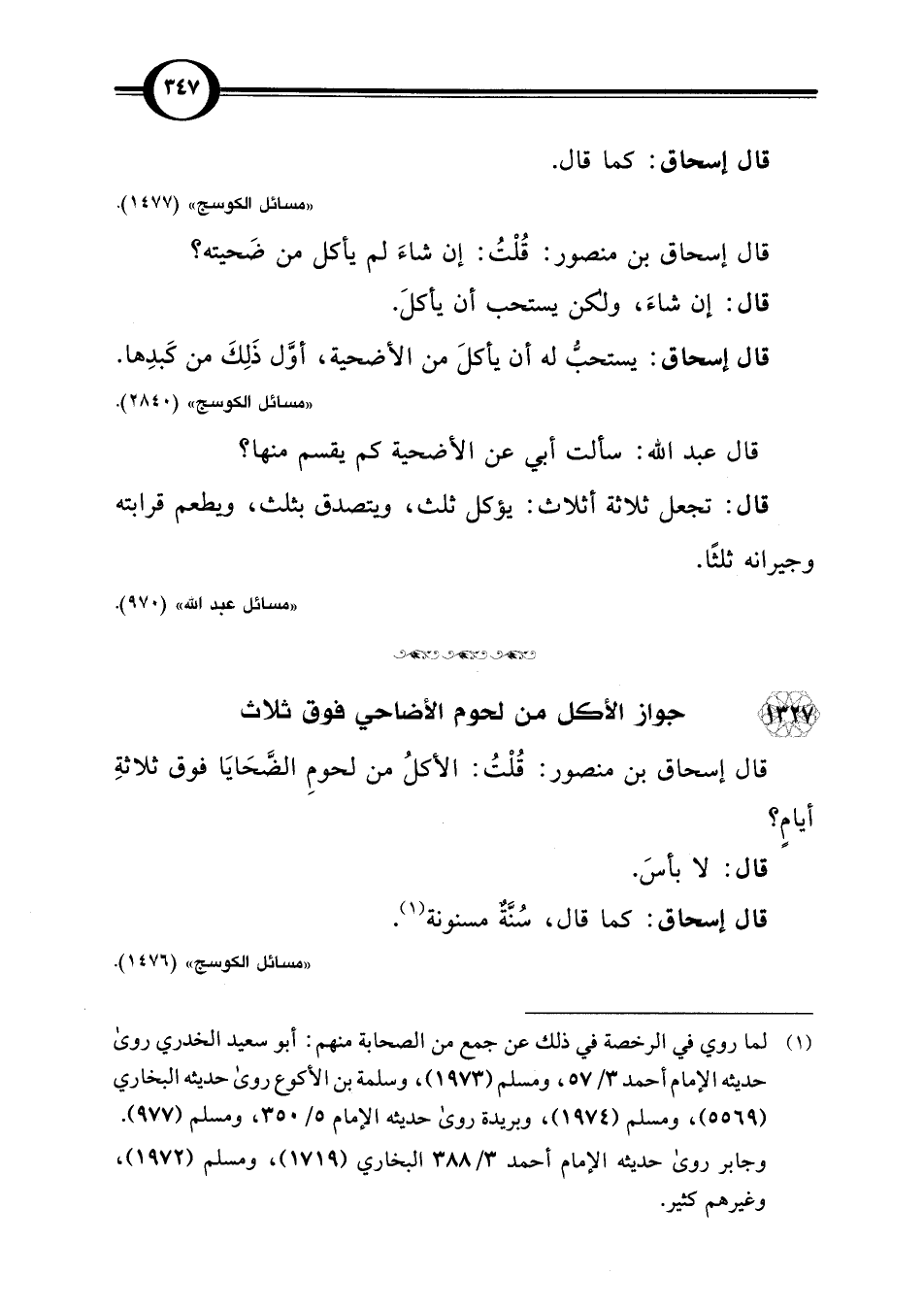 قال إسحاق بن منصور: قُلْتُ: الأكلُ من لحومِ الضَّحَايَا فوق ثلاثةِ أيامٍ؟