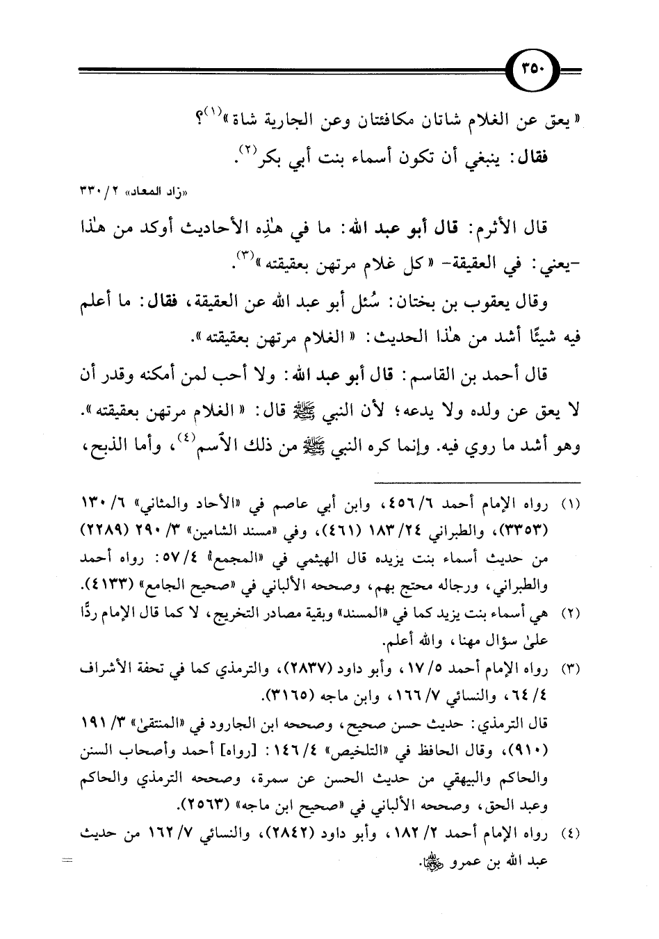 قال أحمد بن القاسم: قال أبو عبد اللَّه: ولا أحب لمن أمكنه وقدر أن لا يعق عن ولده ولا يدعه؛ لأن النبي -صلى اللَّه عليه وسلم- قال: "الغلام مرتهن بعقيقته". وهو أشد ما روي فيه. وإنما كره النبي -صلى اللَّه عليه وسلم- من ذلك الاسم (¬4)، وأما الذبح،