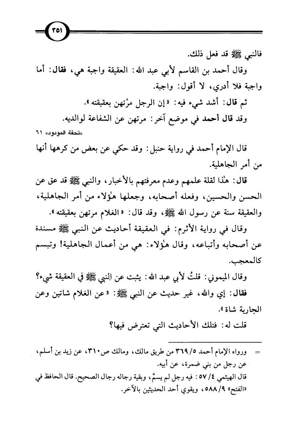 وقال في رواية الأثرم: في العقيقة أحاديث عن النبي -صلى اللَّه عليه وسلم- مسندة عن أصحابه وأتباعه، وقال هؤلاء: هي من أعمال الجاهلية! وتبسم كالمعجب.