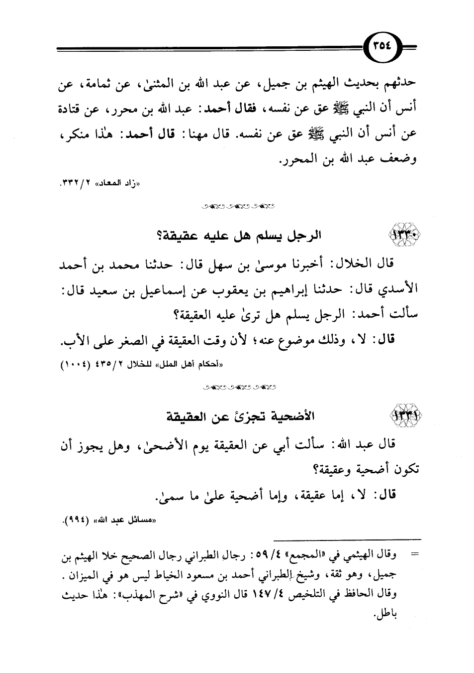 حدثهم بحديث الهيثم بن جميل، عن عبد اللَّه بن المثنى، عن ثمامة، عن أنس أن النبي -صلى اللَّه عليه وسلم- عق عن نفسه، فقال أحمد: عبد اللَّه بن محرر، عن قتادة عن أنس أن النبي -صلى اللَّه عليه وسلم- عق عن نفسه. قال مهنا: قال أحمد: هذا منكر، وضعف عبد اللَّه بن المحرر.